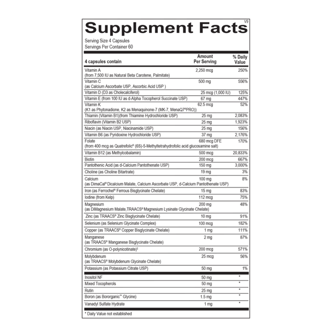 Alpha Base is a comprehensive, hypo-allergenic, multivitamin and mineral blend. As a complete multivitamin, Alpha Base provides high-quality nutrients to build a healthy micronutrient reserve. USP* B vitamins support energy production and folate (as Quatrefolic™ - 100% 5-MTHF), the biologically active form of folic acid, improves methylation. Albion® TRAACS® chelated mineral complexes enhance bioavailability. Alpha Base includes an optimal 2:1 magnesium to calcium ratio. Key antioxidants vitamin C, vitamin E and mixed tocopherols protect cells from free radical damage. Alpha Base also includes the synergistic blend of vitamin K2 (as MK-7) and D3 which are critical for supporting bone strength and cardiovascular health.