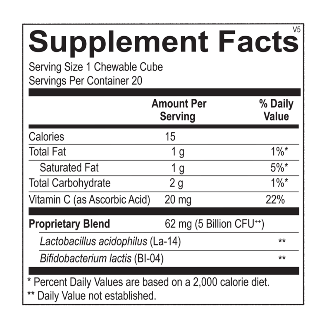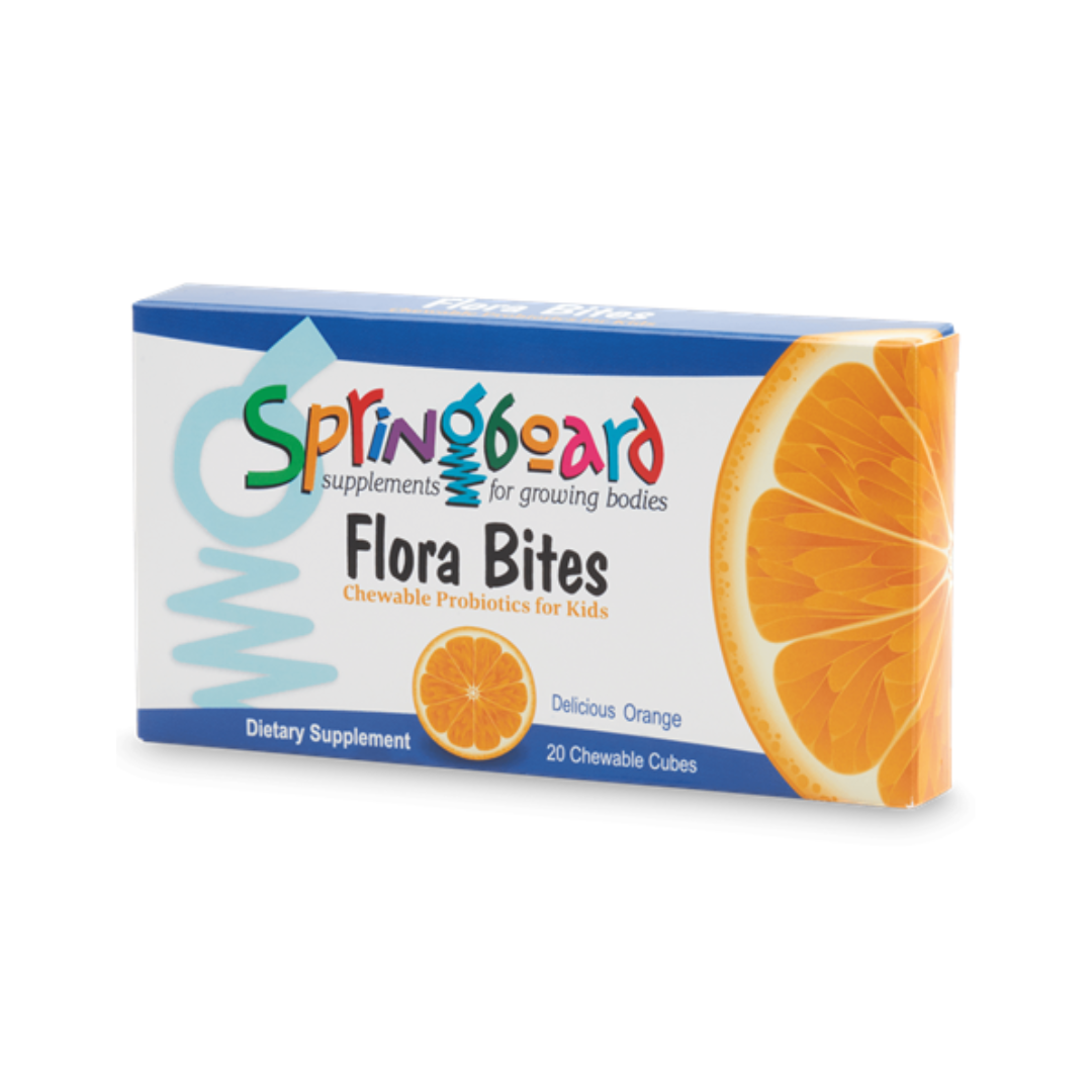 Flora Bites is a delicious, chewable probiotic formula for children, designed to promote healthy gut microflora, protect intestinal integrity and support immune function. Each creamy, natural orange-flavored cube contains a 5 billion CFU blend of Lactobacillus acidophilus and Bifidobacterium lactis, as well as 20 mg of vitamin C for comprehensive digestive and immune system support. The strains in Flora Bites have been carefully selected for their survivability and adherence to the intestinal tract. The chewable cube form is an easy, fun way for children to achieve optimal probiotic support and a tasty alternative to a capsule or powdered probiotic.