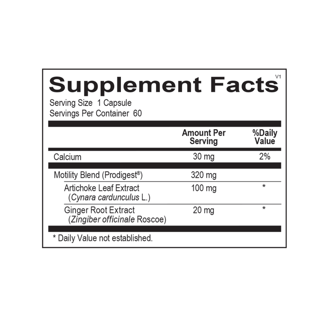 This distinctive blend of bioactives promotes contractions in the migrating motor complex, helping to restore proper motility, which ensures the steady flow of food particles and bacteria through the small intestine. In addition, it provides support for improved digestion and relief from temporary gas, bloating and associated GI discomfort.