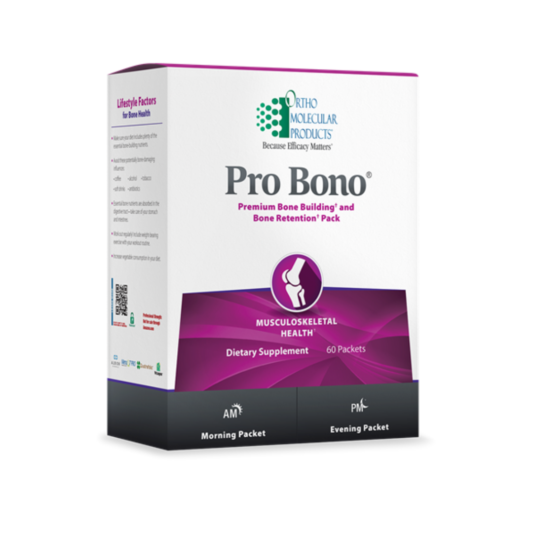 BMD is determined by a lifelong process called bone remodeling. Bone remodeling occurs when bone tissue is removed from the skeleton (bone resorption) and new bone tissue is formed. Osteoclasts are cells involved with breaking down bone, while osteoblasts create a protein matrix primarily of collagen, resulting in the remineralization of bone and thereby promoting bone formation. While calcium is an effective starting point for promoting bone health, other nutrients are required for bone mineralization. Nutrients such as strontium, magnesium, vitamin D, K and C, B complex vitamins, and trace minerals significantly enhance bone remodeling and increase bone strength. Pro Bono® provides a comprehensive approach to bone health by offering a full spectrum of nutrients that are required in the bone mineralization process. Pro Bono® also contains nutrients that help maintain an optimal osteoclast to osteoblast ratio.