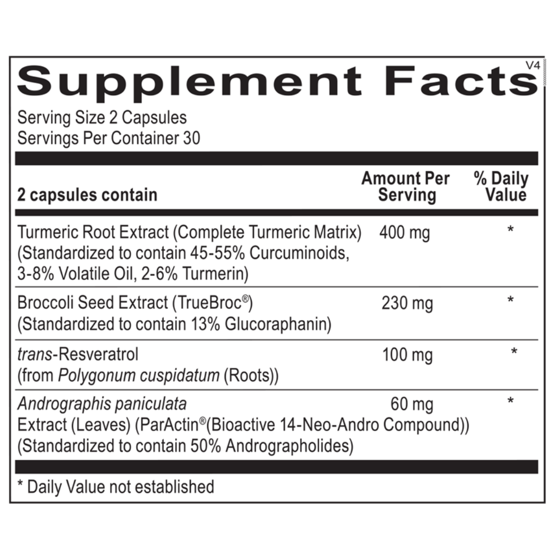Nuclear factor-erythroid-2-related factor 2 (Nrf2) is a transcription factor that regulates the antioxidant response of the body. It is the primary cellular defense against the cytotoxic effects of oxidative stress. Resvoxitrol is a unique combination of phytonutrients designed to enhance antioxidant potential by stimulating Nrf2, a dynamic pathway known to increase the production of the body’s most important cellular antioxidants. This unique combination of truebroc™, turmeric, andrographis, and resveratrol provides potent free radical scavenging potential, maintaining normal inflammatory balance, and induction of intracellular antioxidant production.