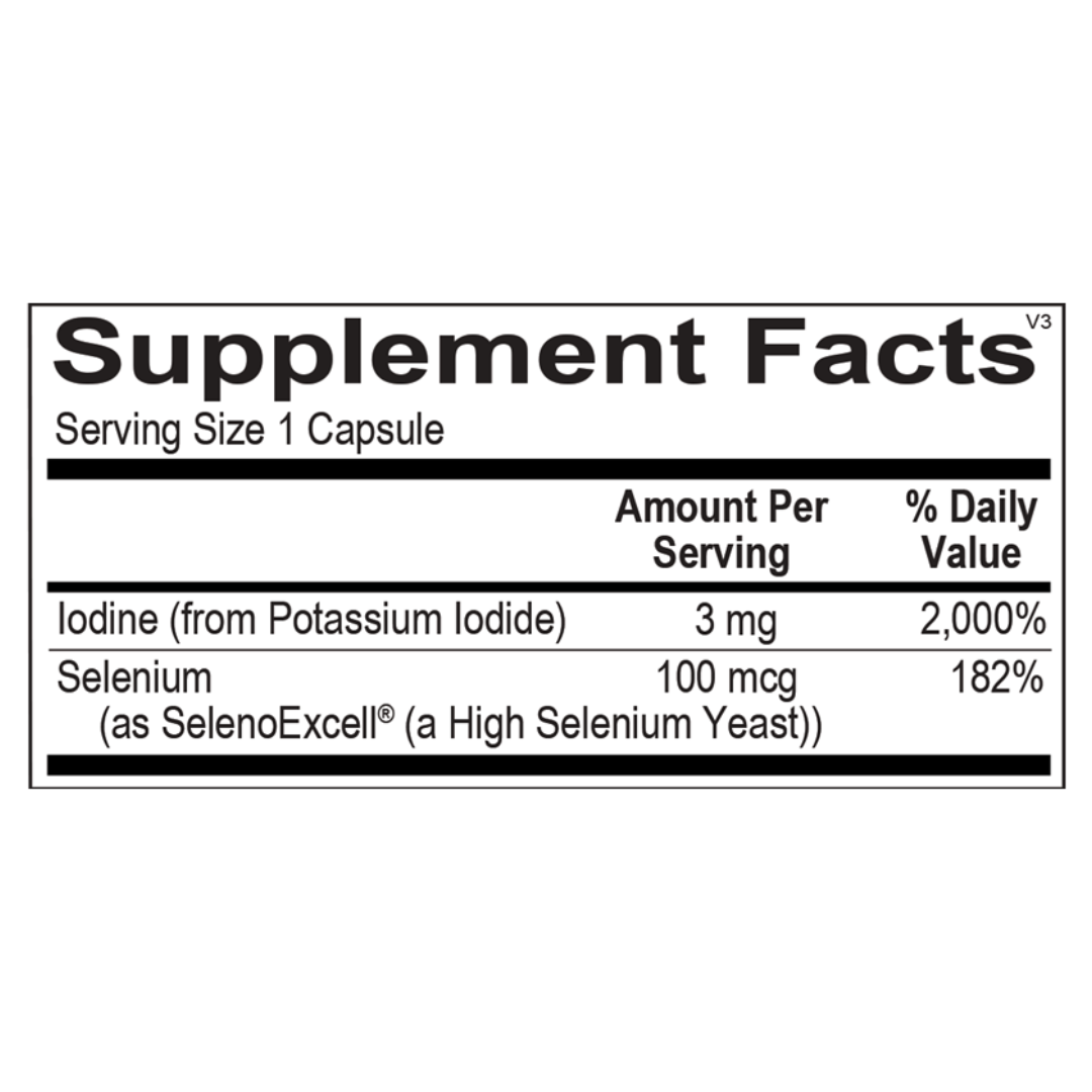 Seleno-Iodide provides a synergistic blend of iodine, along with its trace mineral partner selenium, to help maintain iodine levels and reduce oxidative stress for optimal thyroid and breast health. Seleno-Iodide provides 3 mg of iodine combined with 100 mcg of selenium sourced from SelenoExcell®, a highly bioavailable, organically bound selenium.
