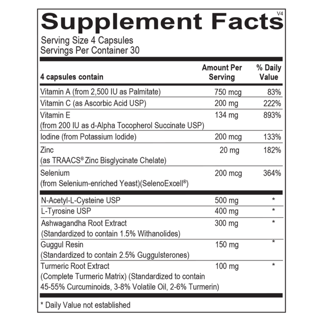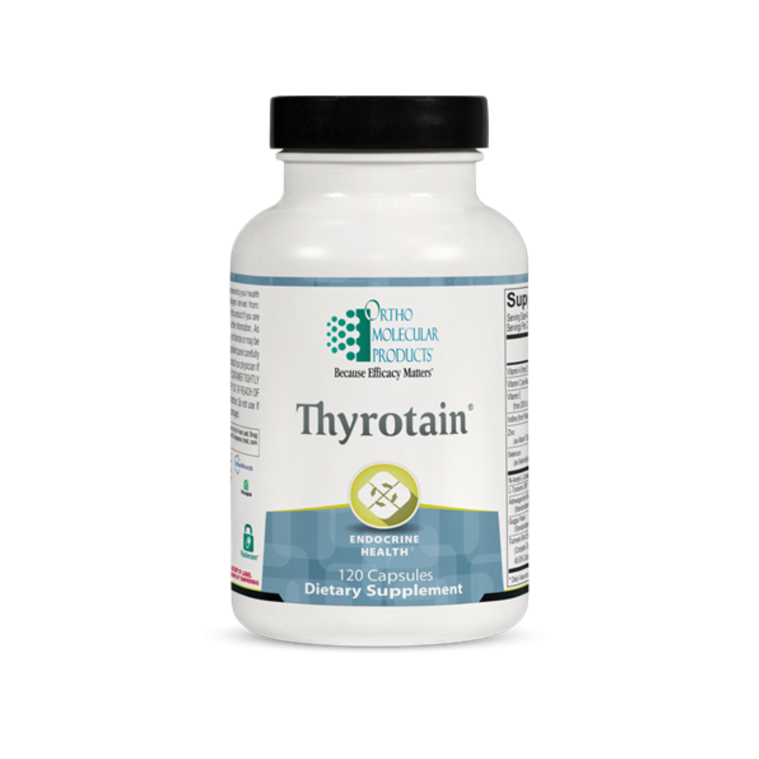 Thyrotain is a comprehensive formulation that provides a blend of nutrients and botanicals working in synergy to support thyroid health. Thyrotain includes L-tyrosine and iodine, which make up the backbone of the thyroid hormones thyroxine (T4) and triiodothyronine (T3). The addition of zinc, selenium, vitamin A, and the botanical guggulipid activate enzymes that enhance the conversion of T4 into the active thyroid hormone T3. Vitamin A and zinc also help improve cellular sensitivity to thyroid hormones. Turmeric, along with the antioxidants vitamin C and E and N-acetyl cysteine (NAC), provide a powerful combination of antioxidants that boost thyroid health by reducing free radical stress.